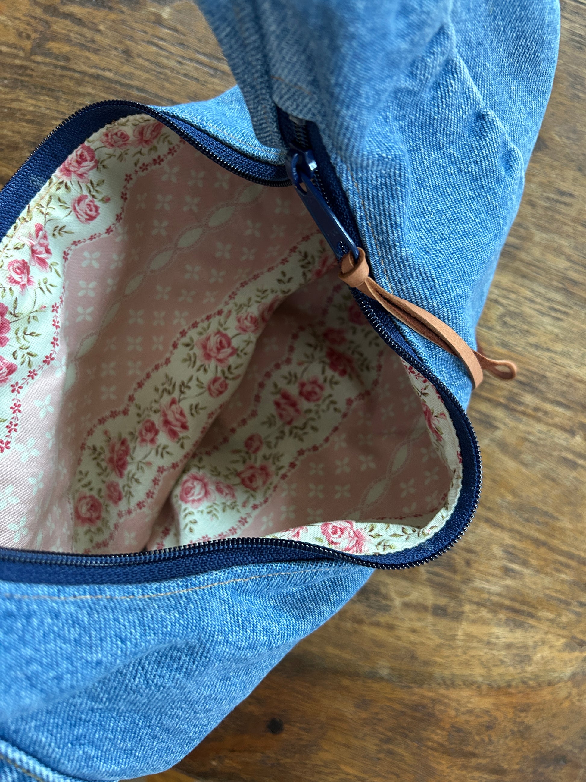 Medium wash denim lined with Pink & Cream Floral Striped cotton fabric